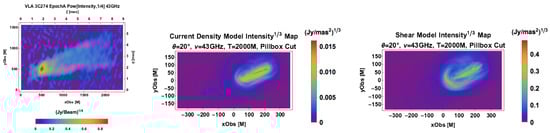 M87 VLA observation (left) at 43 GHz. The total intensity is monotonically transformed by for visual clarity. The beam dimensions are . Synthetic 43 GHz observations are shown for comparison using the current density (middle) and shear (right) models and transformed by .