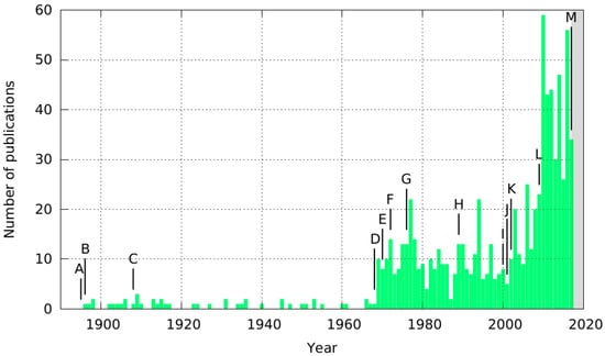 Number of publications focusing on astronomical X-ray polarimetry as a function of time. All types (refereed papers, proceedings, notes, etc.) and all scientific fields (solar physics, compact objects, etc.) are merged. Letters indicate cornerstones in the history of X-ray polarimetry and are detailed in the text.