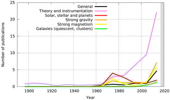 We see in Figure 2 that a subcategory is clearly dominating the others between 1895 and 1968. The theoretical field was, as expected, predating any observation. Papers on specific celestial sources were almost inexistent, as a turning point in the field of high-energy astrophysics was the birth of X-ray astronomy with the first detection of a non-solar source [2]. Moreover, at that time, it was still unclear if X-rays could be polarized and if this polarization could be detected. However, with the onset of the First Age of X-ray polarimetry (circa 1970–1990) and the first flights of rockets and satellites mounted with polarimeters, papers on specifics subjects started to dominate the theoretical and instrumental fields. Led by observations of solar flares and the Crab nebula, the fields of “solar, stellar and planets” and “strong magnetism” science rose above the others. Numerical simulations also started with, e.g., the computation of the effect of special and general relativity onto the polarization of X-rays [21]. However, due to the lack of new observations, the interest of the community for X-ray polarization decreased in 1990. Only the field of “theory and instrumentation” kept growing, as, without new instruments or methods, it would be impossible to go on. Since the mid-1980s, this field presented an almost exponential rise, culminating far above the other subcategories. Only in the mid-2000s, after the development of the gas pixel detector and time projection chamber technologies, did the research community start to make efforts with X-ray polarimetry again. Driven by the technological innovations, these fields of research started to publish new predictions on what would be observed. We note that the “solar, stellar and planets” and the “galaxies” scientific fields are lagging behind. For the former case, this is due to the absence of envisioned missions dedicated to solar and stellar X-ray polarimetry in the next decade. A new mission would certainly uplift the community to work on this field again. In the latter case, the very low X-ray fluxes, coupled with relatively low or inexistent polarization from galaxy clusters, naturally explains why the publication rate in this field is the lowest. Until the advent of extra-sensitive X-ray polarimeters, it is not mandatory to explore in greater detail the expected polarization of quiescent galaxies (save the Milky Way, where important and feasible observations await us [22,23,24]).