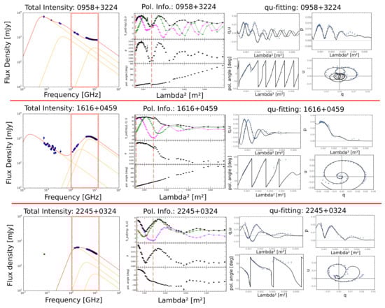 For each row (separated by a red straight line), the following are shown: total intensity plot, polarization information, and depolarization modeling plots for the sources 0958+3224, 1616+0459, and 2245+0324. The first plot is the radio spectrum fit: orange lines are the several synchrotron components and the red line is the total fit. The pink rectangle contains the JVLA data at L, C, and X bands; the second plot is the polarization information with : the top panel is the polarized flux density together with the Stokes parameters Q (pink line) and U (green line), the middle panel is the fractional polarization, the last bottom panel is the polarized angle, and the pink dashed vertical line divides the two frequency bands (C and X bands); the third sequence of plots is the result of the qu-fitting: the upper-left is the q-u behavior, the upper right is the fractional polarization, the bottom left is the polarized angle, all vs. , and the bottom right is the u vs. q behavior. The fit is the black line.