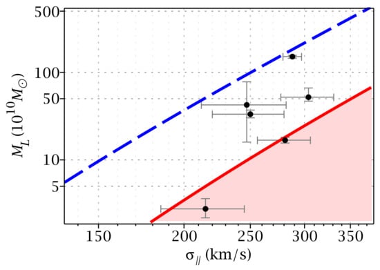 For a small set of lensing galaxies, observational data for both and are available. Ref. [17] studied 21 strong lensing candidates, for which they estimated from the size of the lensed images. The velocity dispersion of six of these galaxies has been measured [18,19,20,21,22,23]. The lensing masses and velocity dispersions for these six objects are included in Table 1, and plotted in Figure 1.