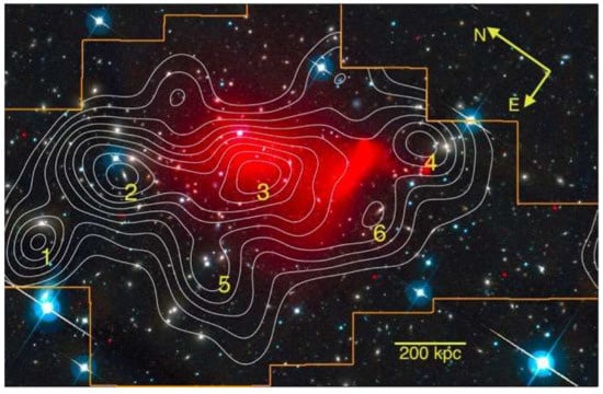 - Clowe, D.; Gonzalez, A.; Markevitch, M. Weak-Lensing Mass Reconstruction of the Interacting Cluster 1E 0657-558: Direct Evidence for the Existence of Dark Matter. Astrophys. J. 2004, 604, 596–603. [Google Scholar] [CrossRef]