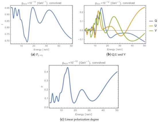 As well as the total flux, upcoming telescopes will measure the linear polarization and polarization angle of X-rays. As shown in Equation (2), only photons polarized parallel to the background magnetic field participate in ALP-photon interconversion. Therefore, the existence of ALPs induces an oscillatory linear polarization in the spectrum of an initially unpolarized source passing through a magnetic field. Even if the source is initially polarized, ALP induced oscillations in are seen. Figure 1b shows the Stokes parameters and Figure 1c the degree of linear polarization for initially unpolarized light passing through Perseus’ magnetic field. These are calculated from the ALP-photon vector in Equation (2) as: