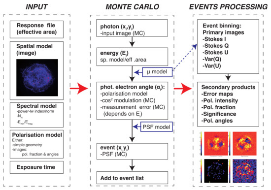 To study the effects of the energy band used, the low polarisation fractions to be expected based on the radio observations, and to study the effects of the point spread function (PSF) on mixing photons from thermally emitting regions with non-thermally emitting regions, it is best to resort to Monte Carlo simulations of the expected signals. Moreover, a Monte Carlo code allows us to test the statistical methods explained in Section 2. We set out to make a Monte-Carlo code to test imaging with the XIPE mission, but since IXPE and eXTP will carry similar detectors and telescopes, the results will be relevant to all three missions. The set-up of the Monte-Carlo code, named xpolim3 is illustrated in Figure 2.