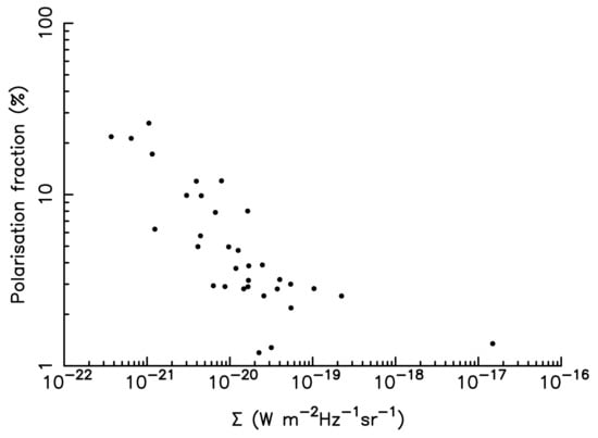 The radio polarisation fraction as a function of the radio surface brightness, taken from [29] and based largely on the sample in [33]. Surface brightness is here a proxy for size and/or age; low surface brightness remnants tend to be larger and older. So this plot shows that young SNRs have low polarisation fractions (few % to ~20%).