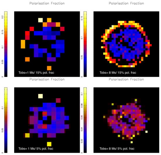 (Top) Polarisation fractions for simulations of Cas A with 1 Ms ((left), pixel size 32) and 8 Ms (right) exposures. (Bottom) Simulated polarisation fractions, but now the outer filaments have input polarisation fractions of 5%. Both in the 2 Ms (left) and 8 Ms (right) the filaments are not detected as a coherent structure.