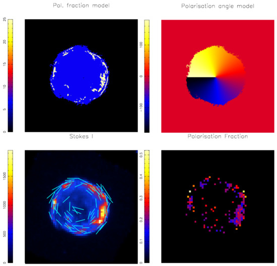 Simulations using a toy input model for Tycho’s SNR, based on the Chandra 4–6 keV image and input maps of polarisation fraction and angle, and assuming an observation time of 2 Ms. The output images are binned to 16 pixels. (Top left) Input model for polarisation fraction (in %). (Top right) model for the polarisation angle (in degrees). (Bottom left) Simulated 4–6 keV count image (Stokes I). (Bottom right) reconstructured polarisation fraction.