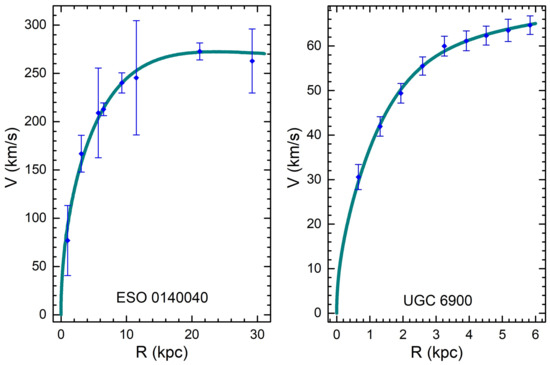 In Figure 1 it is shown examples of interesting fitting curves for the galaxies LSB ESO01400040 and the dwarf UGC 6900 with observational data points extracted from [56,57], respectively.