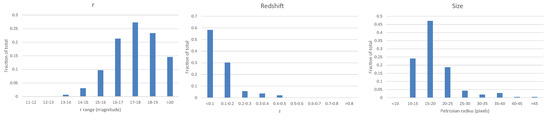 The source code used to create the catalog is also publicly available [30]. Figure 2 shows the distribution of the r model magnitude, the Petrosian radius measured in the r band, and the distribution of the redshift among 115,359 galaxies included in the catalog that also had spectra.