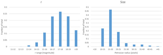 The purpose of the set of galaxies with spectra is to train and test a model to estimate the redshift of the galaxies in the catalog of SDSS galaxies with broad morphology classification [6]. For that purpose, the set of galaxies with spectra that are used for training and testing needs to be as similar as possible to the entire population of galaxies in the catalog it aims at analyzing. Figure 3 shows the distribution of the magnitude and size of the galaxies in the catalog of galaxies with broad morphological classification. As the figure shows, the brightness and size of the galaxies in the catalog is very similar to the brightness and size of the galaxies in the training set.