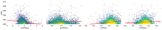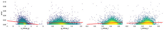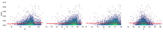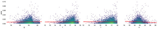 Photometric redshift accuracy can change in different color ranges. Figure 4 and Figure 5 show the change in the absolute and normalized error, respectively, at different magnitudes in the different bands. The red lines show the least square error linear regression.