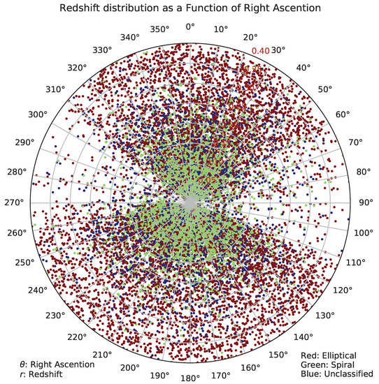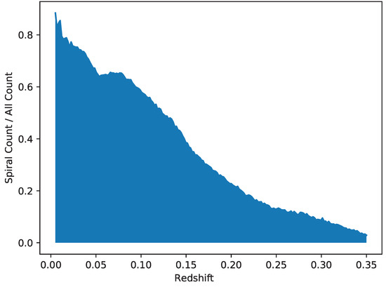 It should be noted that the population of galaxies in the catalog might not represent a random sample of the galaxies in the local universe, but is limited to galaxies that are sufficiently bright and sufficiently large to be analyzed morphologically given the limitation of SDSS imaging power. Elliptical galaxies are brighter than spiral galaxies [40], and therefore the magnitude threshold (i magnitude < 18) can lead to the higher number of elliptical galaxies that meet that threshold to be included in the catalog. Because the redshift and magnitude are strongly correlated, at higher redshifts more elliptical galaxies pass the magnitude threshold compared to spiral galaxies, consequently leading to the higher population of elliptical galaxies compared to spiral galaxies at these redshift ranges.