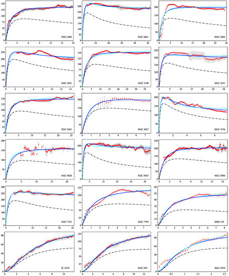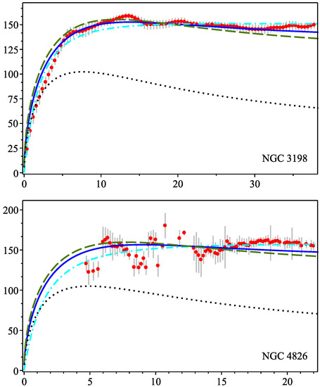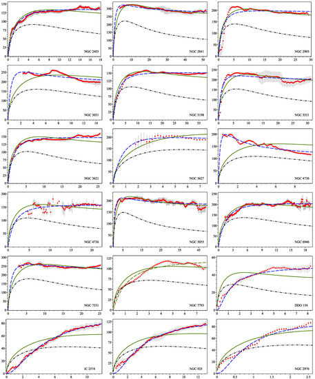 - Sofue, Y.; Rubin, V. Rotation Curves of Spiral Galaxies. Ann. Rev. Astron. Astrophys. 2001, 39, 137–174. [Google Scholar] [CrossRef]