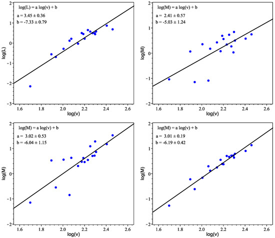 (color online) The Tully-Fisher relation. Left-top panel: the observed B-band Tully-Fisher relation. Vertical axis gives the base 10 logarithm of the observed luminosity (in units of , respectively ) and the horizontal axis is the base 10 logarithm of the last observed velocity (in km/s). Left-bottom panel: best fit Tully-Fisher relation parameterized by in the case of MOND. Right-top panel: Tully-Fisher best fit for the masses resulted from the parametric model given by Equation (17) using the mass distribution (7), respectively. Right-bottom panel: Tully-Fisher relation obtained using the spherical version of the exponential disk mass distribution (21). The value of M used in the plots is the total mass of a given galaxy: .