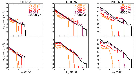 Evolution with time of the differential emission measure (DEM) of hot bubbles for the stellar models with initial masses of: 1 M (left); 1.5 M (middle); and 2.0 M (right). Upper and lower panels correspond to cases without and with thermal conduction, respectively. Times are marked with different colors. These panels have been taken from [12].