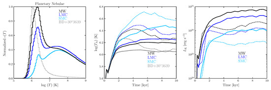 Using the extensively tested Chianti database version 7.1.3 [17], we calculated the emission coefficient corresponding to the soft X-ray energy band (0.3–2.0 keV). Figure 2 (left) shows the emission coefficient for PNe chemical abundances in our Galaxy and in the Large and Small Magellanic Clouds (LMC and SMC, respectively) (see Appendix in [13] for details). Note that the different curves show two peaks: the main one peaks around log depending on the abundance set. The secondary peak at log is only present for the hydrogen rich cases.