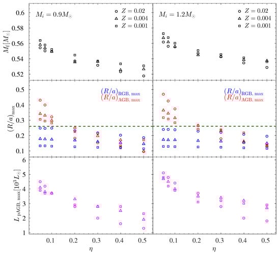 The summary of the evolution of a star (left plot) and a star (right plot). For each star we studied the evolution from zero age main sequence until the formation of a white dwarf, for several mass-loss rate efficiency parameters, from (the “traditional” commonly mass-loss rate) to as low as . We present the evolution for 3 metallicities: (circles), (triangles) and Z = 0.001 (squares). The upper panels present the final white dwarf mass of each star. The middle panels present the maximum value of the stellar radius over the orbital separation, , for both the red giant branch (RGB; blue) and the asymptotic giant branch (AGB; red). The companion mass is and the initial orbital separation taken is . The green horizontal line indicates the capture condition above which planet engulfment can take place (Equation (2)). The lower panels present the maximum value of the luminosity on the post-AGB, .