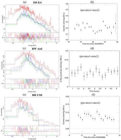 X-ray spectra (colored curves: XMM-Newton/EPIC pn, red; MOS1, green; and MOS2, blue) and model fits (black curves) of the fuvAGB stars DH Eri, RW And and RR UMi (panels a, c, e), and X-ray light curves (black symbols) (panels b, d, f). As for most fuvAGB stars, DH Eri and RW And are each fitted by a single hard component (Tx K) (panels a & C, respectively), but in RR UMi (panel e) the dominant emission component has Tx that is significantly lower (Tx(1) K); a weaker harder component (Tx(2) K) is also present (adapted from Sahai, Sánchez Contreras and Sanz-Forcada 2018, in prep.).