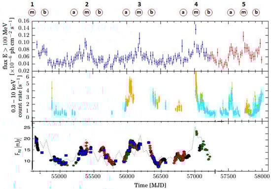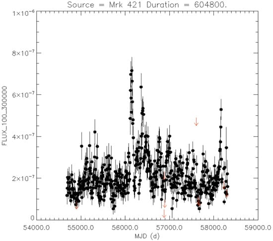 - Ackermann, M.; Ajello, M.; Atwood, W.B.; Baldini, L.; Ballet, J.; Barbiellini, G.; Bastieri, D.; Gonzalez, J.B.; Bellazzini, R.; Bissaldi, E.; et al. The Third Catalog of Active Galactic Nuclei Detected by the Fermi Large Area Telescope. Astrophys. J. 2015, 810, 14. [Google Scholar] [CrossRef]