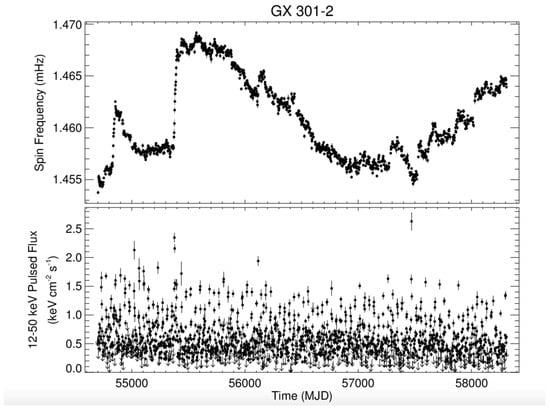- GBM Accreting Pulsar Histories: https://gammaray.nsstc.nasa.gov/gbm/science/pulsars.html. Over 30 accreting pulsars are monitored by the GBM in the energy range 12–50 keV. The pulse periods and flux values are updated regularly. An example is shown in Figure 2.
