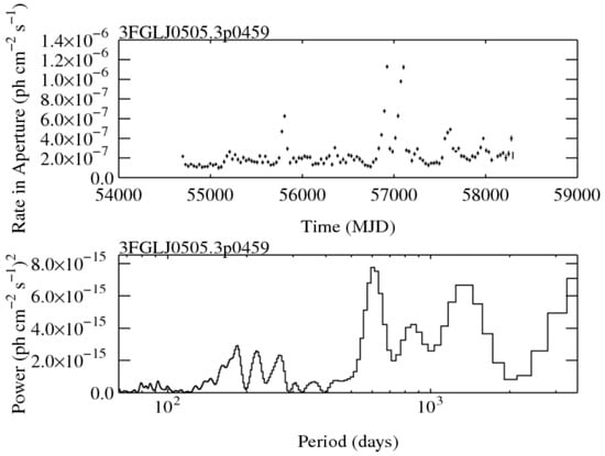 Figure 3. Fermi-LAT aperture photometry light curve and periodicity analysis for PKS 0502+049 as a function of MJD. The analysis shows no significant periodicity. - Fermi Solar Flare X-ray and Gamma-ray Observations: https://hesperia.gsfc.nasa.gov/fermi$_$solar/. This collection of links offers extensive information about both GBM and LAT solar observations.