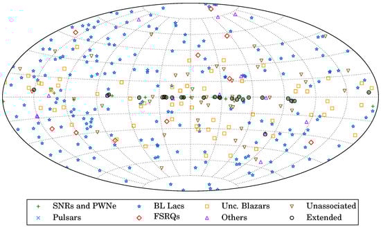Figure 4. Sky map, in Galactic coordinates and Hammer-Aitoff projection, showing the sources in the 2FHL catalog classified by their most likely association []. ( ©American Astronomical Society, AAS. Reproduced with permission.) - A Radio-quiet Millisecond Pulsar. Using 5.5 years of LAT data, combined with advanced pulse-searching methods, the Einstein@Home distributed computing project was able to reveal two millisecond pulsars in blind searches, and one of these was the first radio-quiet millisecond pulsar []. Although the Einstein@Home project was able to accumulate the equivalent of 10,000 years of CPU time, this computing power still required enough detected rays to make this discovery. The pulse profiles of the two pulsars, along with the pulse phases of individual rays, are shown in Figure 5.