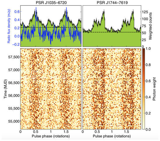 Figure 5. Rotational phases of individual rays (bottom) and integrated pulse profiles (top) of the newly detected millisecond pulsars. Each photon has been assigned a weight, determined by its energy and arrival direction, representing the probability of it having come from the -ray source in question. The blue line is the radio signal from PSR J1035−6720 []. (©American Association for the Advancement of Science. Reproduced with permission.)