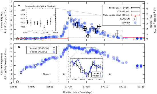 Figure 7. The top panel (a) shows the -ray (black and gray crosses, and red arrows) and bolometric (blue and black circles) light curves of ASASSN-16ma in flux units of ergs cm−2 s−1, using observations from Fermi LAT and ASAS-SN/AAVSO. The bottom panel (b) shows the V-band light curves of the same optical datasets on a magnitude (logarithmic) scale. The inset box in (b) zooms in on the emission dip at MJD 57705 in rays and optical, which directly show the co-variance of the -ray and optical emission on time-scales as short as 0.5 days []. (©Springer Nature. Reproduced with permission.)