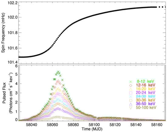 Figure 9. (Top): Barycentered and orbit-corrected spin-frequency history of Swift J0243.6+6124 measured with GBM. (Bottom): Pulsed flux measured with GBM in nine energy bands []. (©AAS. Reproduced with permission.)