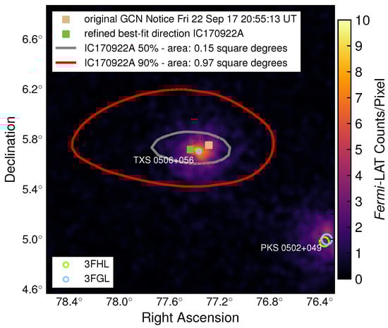 Sky position of IceCube-170922A overlaying the -ray map from Fermi LAT above 1 GeV []. The tan square indicates the position reported in the initial alert and the green square indicates the final best-fitting position from follow-up reconstructions []. Gray and red curves show the 50% and 90% neutrino containment regions, respectively, including statistical and systematic errors. Fermi-LAT data are shown as a photon counts map in 9.5 years of data in units of counts per pixel, using detected photons with energy of 1 to 300 GeV in a 2° by 2° region around TXS 0506+056. Also shown are the locations of a -ray source observed by Fermi-LAT as given in the 3FGL [] and 3FHL [] source catalogs, including TXS 0506+056. For Fermi-LAT catalog objects, marker sizes indicate the 95% confidence level positional uncertainty of the source. (©American Association for the Advancement of Science. Reproduced with permission.)