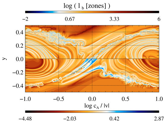 Snapshots of a certain model from [122]. It is taken shortly after the termination of the kinetic amplification phase. The top panel shows the characteristic length scale of the magnetic field, in units of the zone size. Regions where magnetic structures are larger than one computational zone are depicted in orange-red colors and blue colors where they are smaller than one zone size. The bottom panel shows the ratio between the Alfvén velocity and the modulus of the fluid velocity. Strongly magnetized regions are depicted in blue, whereas weakly magnetized regions are depicted in orange-red. (Reproduced with permission from [122], © ESO, 2010).