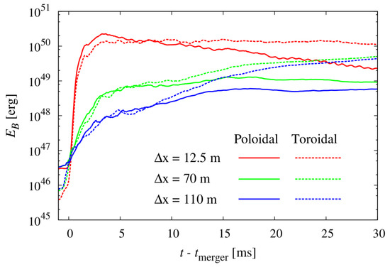The evolution of the magnetic-field energy as a function of time from [125]. The growth of the magnetic field is evident in the first five milliseconds. However, the strong dependence on resolution indicates that the upper limit of amplification is unknown. Solid and dashed curves indicate the poloidal and toroidal magnetic field components, respectively. (Reprinted with permission from [125]. © (2018) by the American Physical Society.)