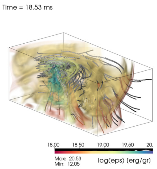 The structure of the torus for a model from [119]. 3D snapshot of the specific internal energy and the magnetic field lines at t = 18.3 ms. Two main points are illustrated in the figure: (i) the structure of the toroidal magnetic field inside the torus; and (ii) the excess of internal energy close to the polar axis where the low density funnel is produced. (Reprinted with permission from [119]. © (2016) by the American Physical Society).