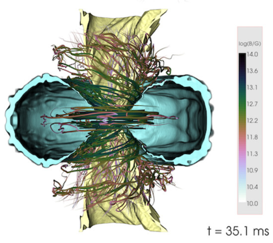 It was further shown and confirmed in a resistive MHD framework that, at least for merger remnants that collapse in the first ∼10 ms, the BH-torus system produces a low density funnel above the BH [119]. The excess of the internal energy in this low density region above the newly formed BH could lead to the production of a jet (Figure 3). However, how low is low? To launch an outflow, it is necessary that at least the magnetic pressure in the jet interior can accelerate the fluid in the polar region. Previous studies [119,130] used an ideal fluid equation of state (EOS), whereas in [121], a piece-wise polytrope was used, and it was pointed out in [69,133] that the jet structure indeed depends on the EOS. Other studies have also reported the production of a magnetic structures when using a different EOS [134,135], also including a neutrino treatment [120]. In Figure 4, such a configuration with a BH-torus system is depicted. In this specific model, the merger product collapsed to a BH at 8.7 ms. The snapshot is taken at 35.1 ms after merger. In the low density funnel above, the BH the magnetic structure is clearly seen.