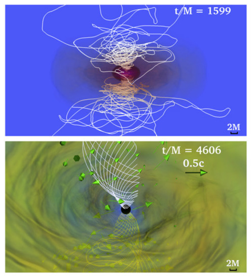 - Komissarov, S.S. Direct numerical simulations of the Blandford-Znajek effect. Mon. Not. R. Astron. Soc. 2001, 326, L41–L44. [Google Scholar] [CrossRef]