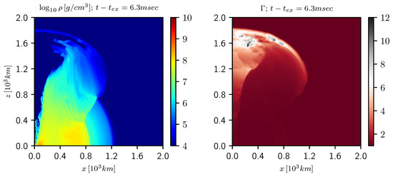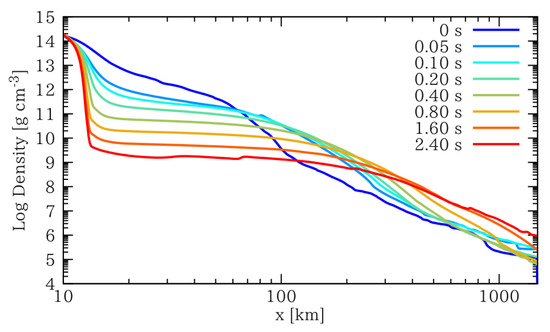 where quantities are for the expanded torus at 1 s after merger. The density in the poloidal plane is shown in Figure 7 at time 1.6 s after merger. The density drops around 5–6 orders of magnitude in the first 1300–1500 km. The possibility that no debris disk is formed at all has also been discussed [147,148].