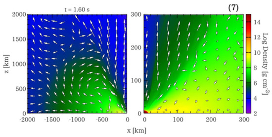 Snapshots of the density and poloidal velocity field for a model from [108]. The velocity vectors and their length correspond to the logarithm of the velocity in the poloidal plane. The left panel shows a region of 2000 km, whereas the right panel a narrower region of 300 km. This profile corresponds to 1.6 s after merger. (Reprinted from [108]. © AAS. Reproduced with permission).