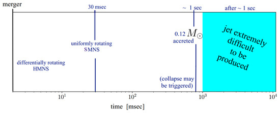 The lifetime of the merger remnant of mass close to the maximum for uniform rotation. The remnant does not collapse when differential rotation is lost, but collapse may be triggered when almost 0.1 has been accreted. If collapse is triggered after one second, then the production of a jet may not be favoured. In this case, an explosion is triggered, releasing the enormous amounts of magnetic energy stored in the magnetosphere of the SMNS as discussed in [183]. (Reprinted from [183]. © AAS. Reproduced with permission).