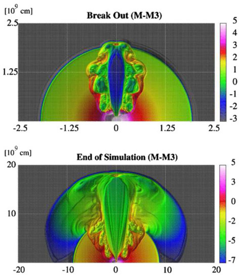 - Nagakura, H.; Ito, H.; Kiuchi, K.; Yamada, S. Jet Propagations, Breakouts, and Photospheric Emissions in Collapsing Massive Progenitors of Long-duration Gamma-ray Bursts. Astrophys. J. 2011, 731, 80. [Google Scholar] [CrossRef]