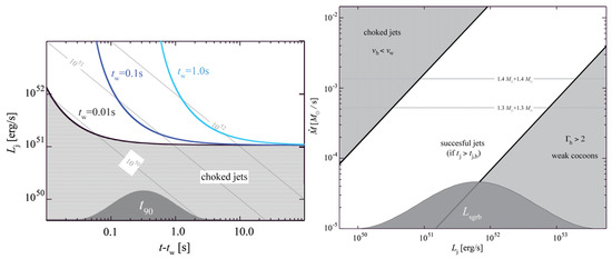 Their wind profile depends on how long the neutrino driven wind was active. At the time that the wind stops, a jet is injected. In Figure 10 (left panel), a parameter study is presented on whether the jet can break out or not from such a wind. The axes are the luminosity of the jet versus time, where depicts the time that the neutrino wind stops, supposedly when the merger remnant collapses to a BH. Matter is injected in the wind as with a velocity of . The coloured lines indicate a different termination time for the neutrino wind, where is the time that the neutrino wind stops. As a comparisonm the distribution (the duration distribution of short GRBs from [78,198]) is overplotted to show that when the neutrino wind operates for more than s then jet duration times that exceed the observed ones are needed. Interestingly, all jets with luminosities less than erg s are choked and never break out from the neutrino wind. This can be regarded as the limiting value for the production of a structured jet with a cocoon or a choked jet with a cocoon.