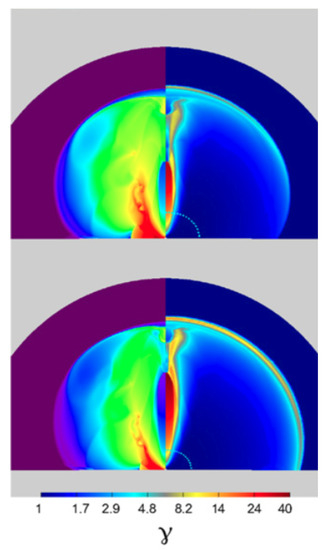 - Blandford, R.D.; McKee, C.F. Fluid dynamics of relativistic blast waves. Phys. Fluids 1976, 19, 1130–1138. [Google Scholar] [CrossRef]
