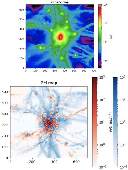 A scenario complementary to the “primordial” one is the one in which the seeding of magnetic fields in large-scale structures is entirely due to the “pollution” of magnetic fields by active galactic nuclei and galactic activities (e.g., [38,39]). In this case, less correlation should be expected between density and magnetic field fluctuations, yet the range of magnetic field values in filaments (and hence of RMs) is expected to be much more extended than in a primordial scenario, owing to the dilution of ejected magnetic fields away from sources, as well as by the expected drop in the number density of sources moving into the less dense Universe (e.g., [32,33]).