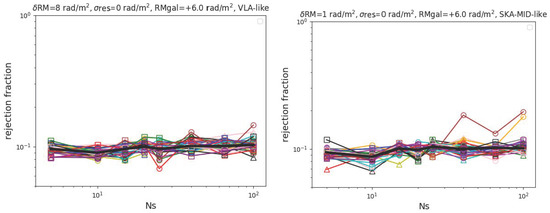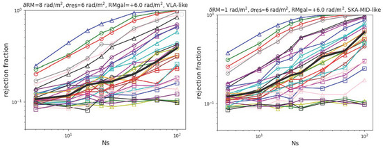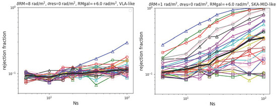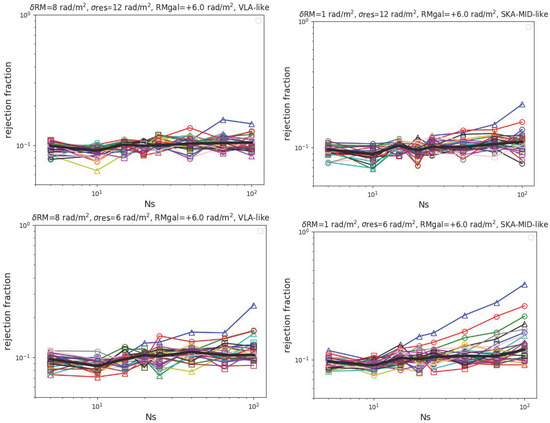 Rejection fraction for an increasing number of detected RM as in Figure 2, but by assuming rad/m2 for the residual RM of sources (top panels), while the lower panels we assumed rad/m2.