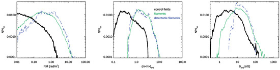where is the seed field, is the cosmic mean (gas) density and for isotropic gas compression. Cosmic filaments are only mildly non-linear objects of the cosmic web, and their average density is 5–10 (e.g., [35,36], hence their average magnetic field is only ∼3–5 times larger than the original seed field. However, recent MHD simulations of cosmic filaments showed that the axial gas density profile of filaments is stratified at least over one decade [37], as well as that the gas density fluctuations within filaments can extend up to ∼2–3 decades in range, due to presence of substructures [34]. Hence while Equation (3) gives a lower limit on the average magnetic fields in filaments for a given primordial magnetic seed, the internal distribution of magnetic field fluctuations can be as large as – in simulations [34]. If this also happens in the real Universe, we should expect that the distribution of RMs from filaments can stretch over ∼4–5 orders of magnitude, since density and magnetic field fluctuations are well correlated in the compressive regime, which would likely bias detections of RM towards the highest value of the distribution.