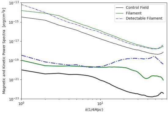 We thus computed the power spectra of magnetic fields in different 3-dimensional sub-volumes in the field of our cluster e18b, motivated by recent simulations by our group, in which the signature of magnetic dynamo in the innermost cluster regions clearly stems in power spectra [53]. in particular we selected a cubic box coincident with a clearly detectable filament connected to the cluster (right of the cluster centre in Figure 1), a similar box coincident with an undetectable filament (left of the cluster centre), and a cubic volume on an empty “control field” located at the cluster virial radius of e18b. The 3-dimensional power spectra of magnetic field and of the density-weighted velocity field () 2 were computed with a standard Fast Fourier Transform (FFT) algorithm, similar to our previous work (e.g., [31]), and are shown in Figure 5.