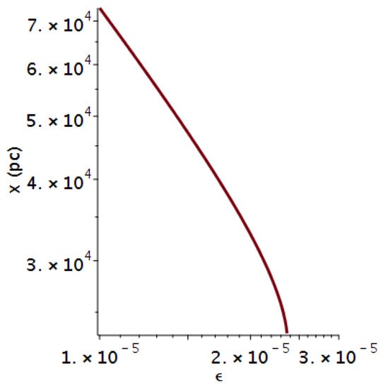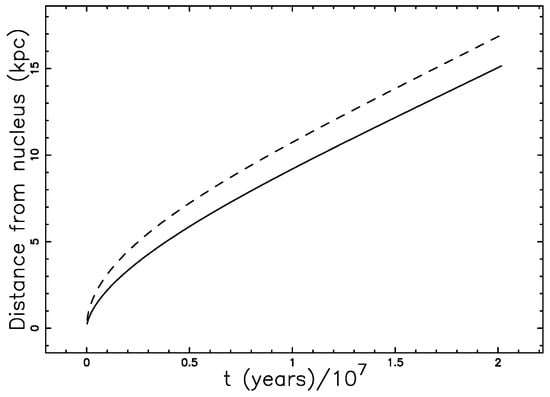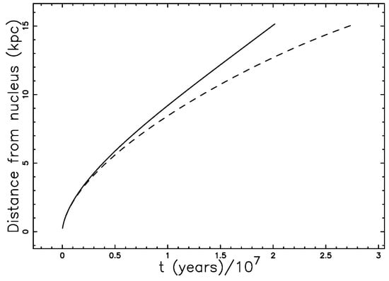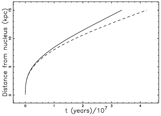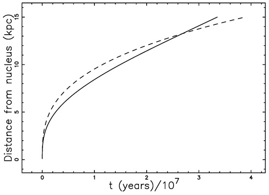 In the above analytical result, we have the time as a function of the distance (see Figure 7 with parameters as in Table 2 ), where the percentage error at kpc is .