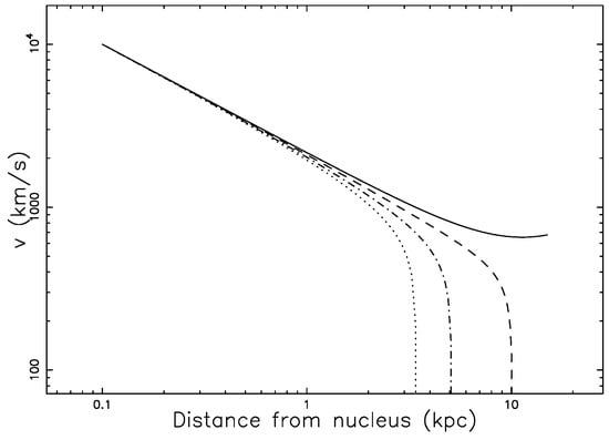 - The velocity of the jet decreases with an imposed law (see [7]) or is evaluated by a numerical code (see [8,9]). In this case, the relativistic parameter decreases along the trajectory.