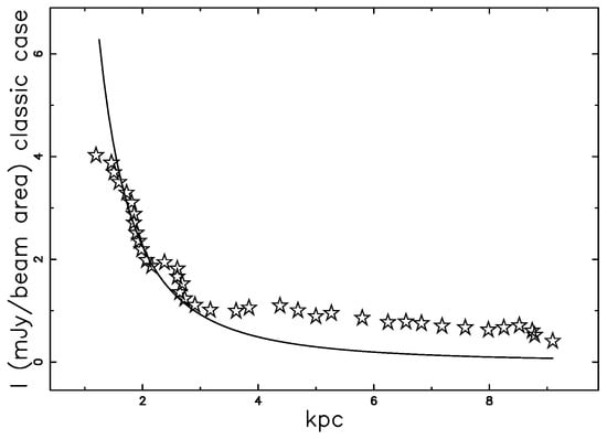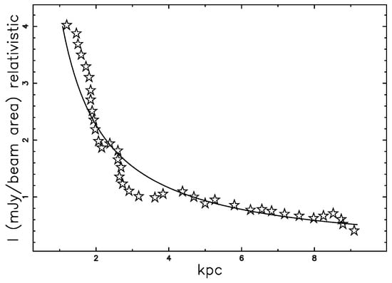 In order to make a comparison with the observed profile of intensity, we chose 3C31; see Figure 8 in [7]; Figure 10 shows the theoretical synchrotron intensity, as well as the observed one.