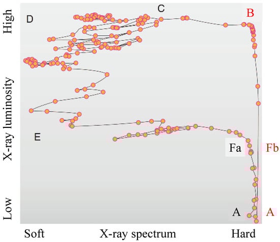 F: The Low Hard state. The return point. The system reaches the Low Hard state and then decides to turn downwards in the HID and return to the quiescent state. Position Fa during the descending phase is very close to position Fb during the ascending crossing of the Low Hard state. The system configuration must be very similar at Points Fa and Fb (similar spectra and luminosities, similar disk types, similar radio emissions, and similar distributions of large-scale magnetic field through the disk), yet in the former the system traverses the HID downwards, whereas in the latter it traverses it upwards. Why that happens remains unexplained.
