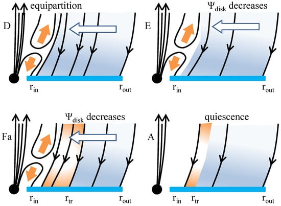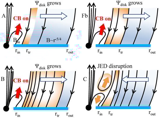 31]. In the ascending phase of the HID (the growing phase of the outburst), the disk is slowly filled with magnetic flux, and the field at its inner edge becomes stronger and stronger with time according to Equation (